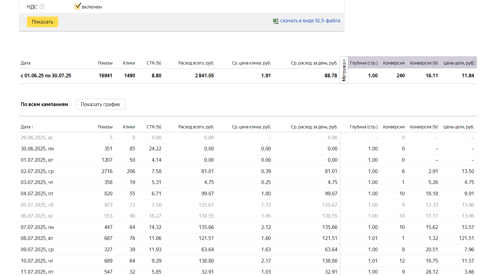 Скриншот одного из аккаунтов за месяц: 240 конверсий по 12 р.