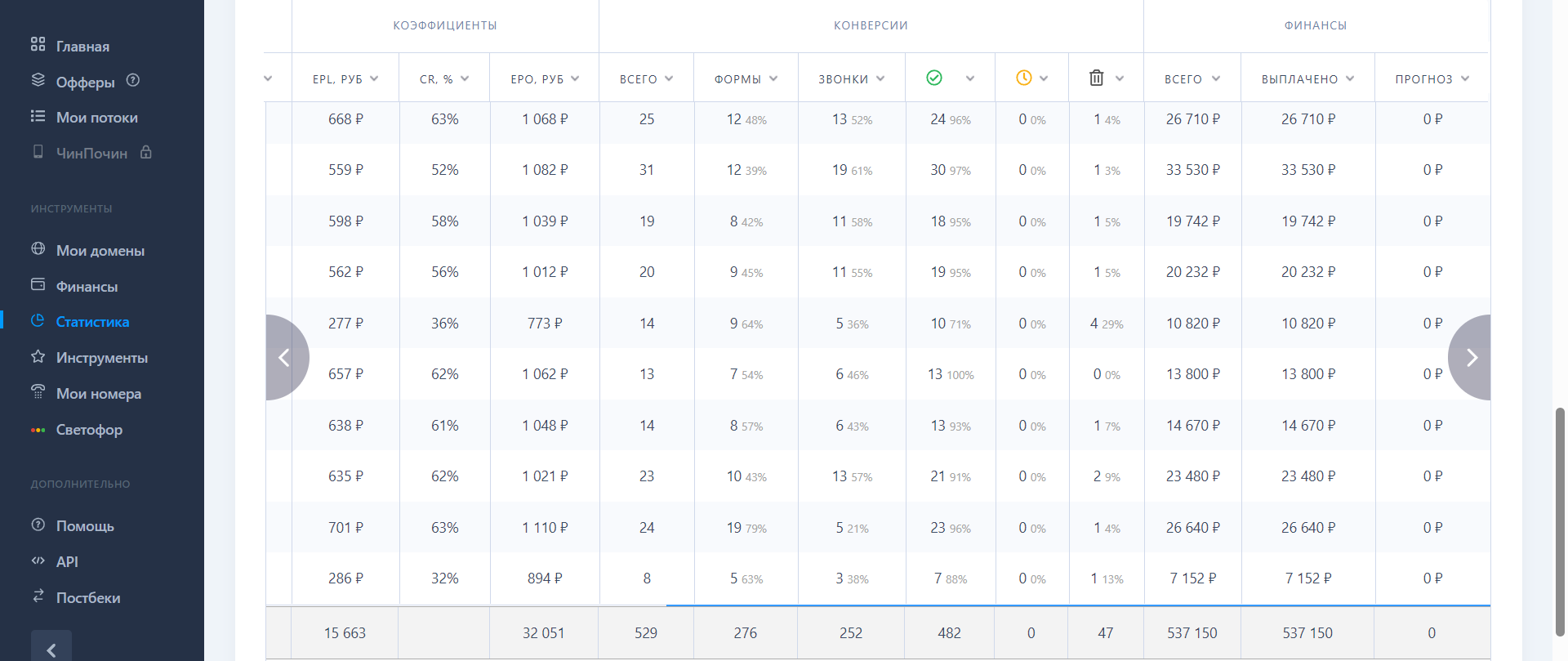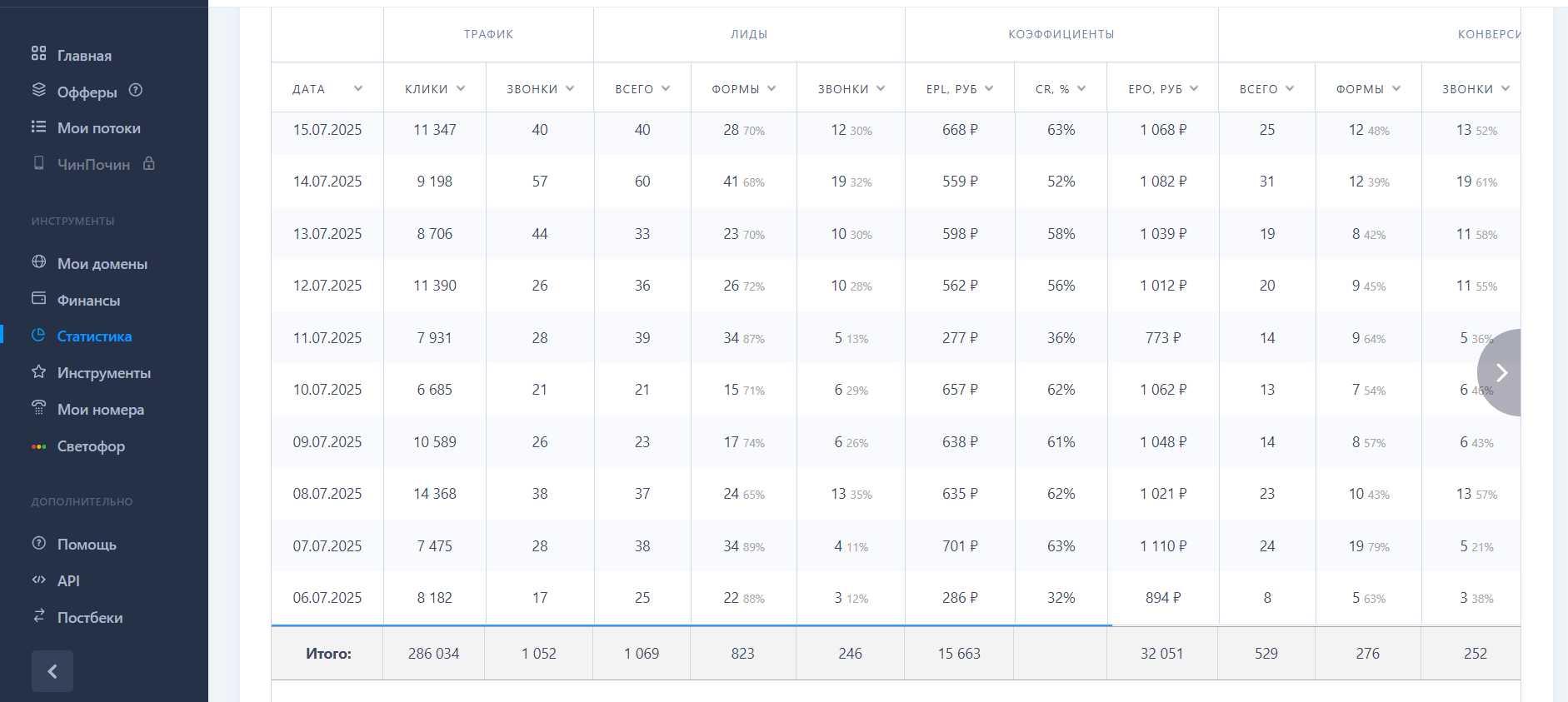 Скриншот статистики из кабинета партнерки servicelead.top: