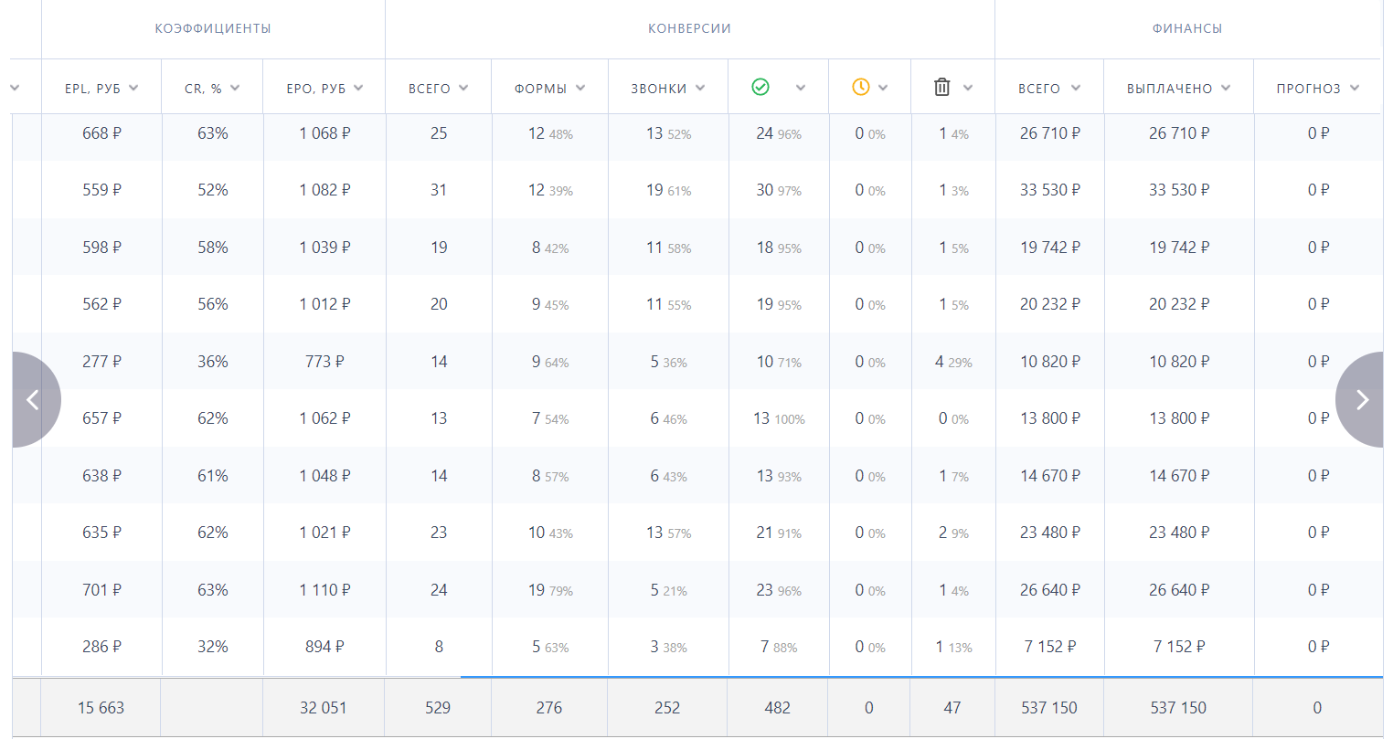Из 1069 лидов подтвержденных конверсий 529 (50% подтверждения хороший результат, это говорит о том, что трафик идёт достаточно качественный), из них 482 конверсии были оплачены, 47 ушло в трэш (это означает, что клиент уже после подтверждения заявки отказался от выезда мастера) и сумма выплат за месяц составила 537 000₽. Для того, чтобы привлечь такое количество трафика, на рекламный бюджет было потрачено около 120 000 р., и это при том, что дополнительно еще экспериментировали и запускали аккаунты за клики и с другими стратегиями. Без этого затраты были бы ниже.